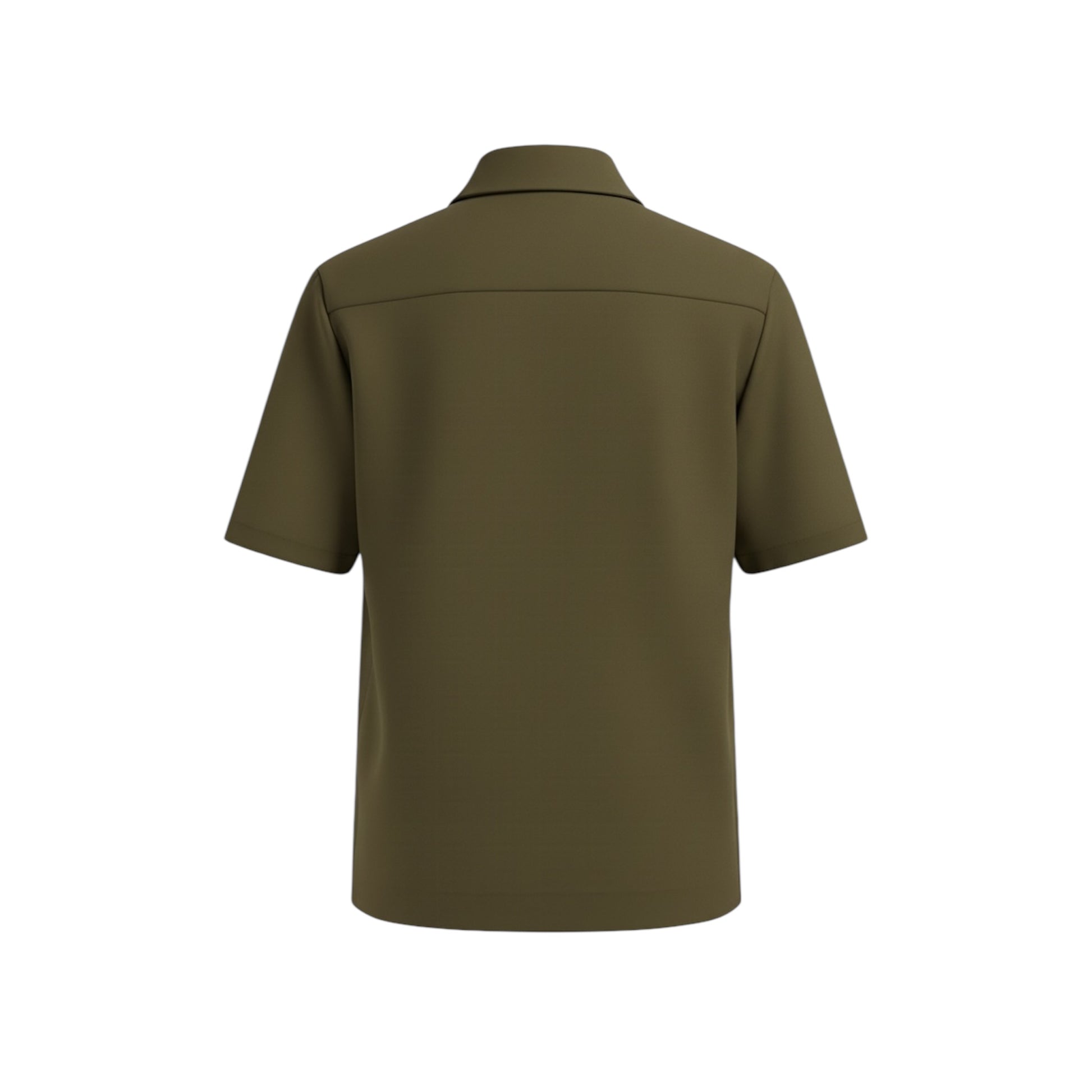 crafted from a comfortable wool and cotton blend with a relaxed fit, offering a looser, more comfortable drape. It features a unique, sculpted black appliqué on the chest and shoulder, creating a striking contrast against the olive green fabric. Designed with a classic short-sleeve cut, it's perfect for a casual yet elevated look. Made in China.