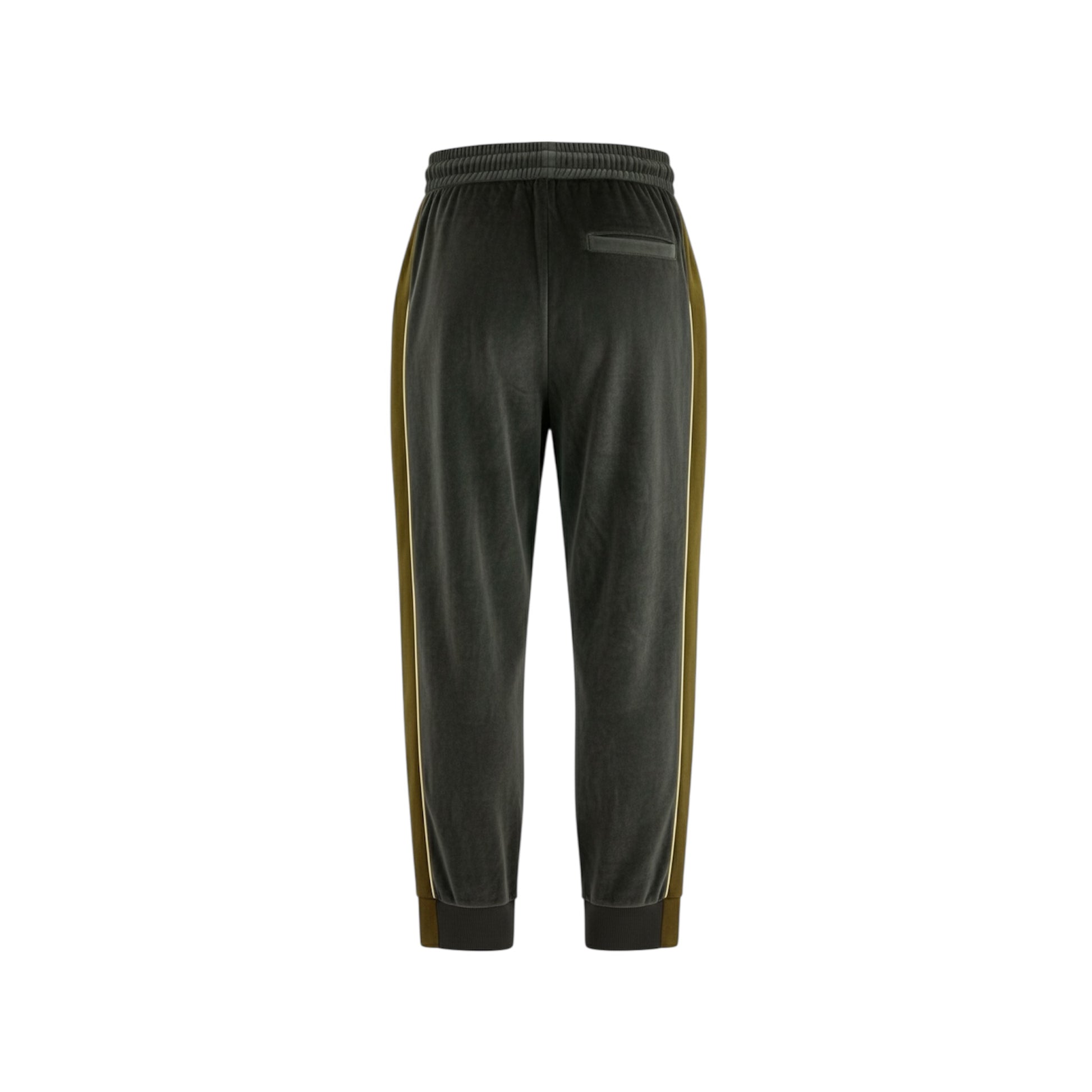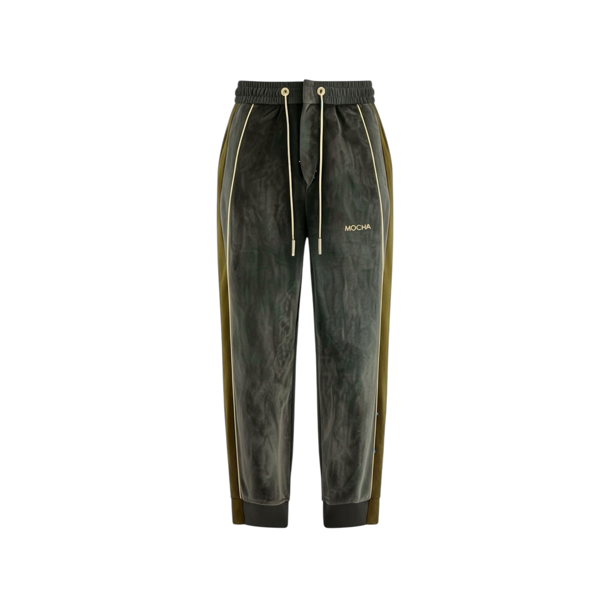 Luxurious plush cotton velvet track pants with modern, sporty design. Features elastic waistband and drawcord for adjustable fit, ribbed cuffs for clean silhouette. Embroidered "MOCHA" logo.