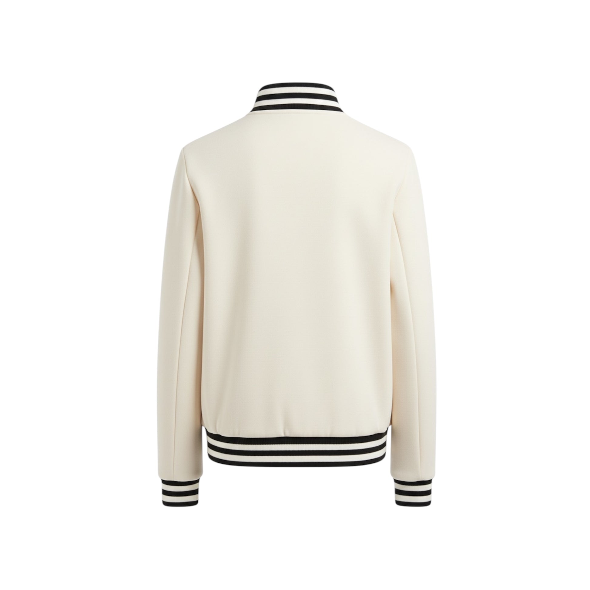 The Collegiate Bomber is a modern jacket that blends comfort with an elevated design. It is made from a premium blend of wool, polyester, and cotton and features a unique horse head appliqué on the left chest. The classic bomber style includes ribbed details and a snap-button closure, with a black and white color scheme. Made in China.