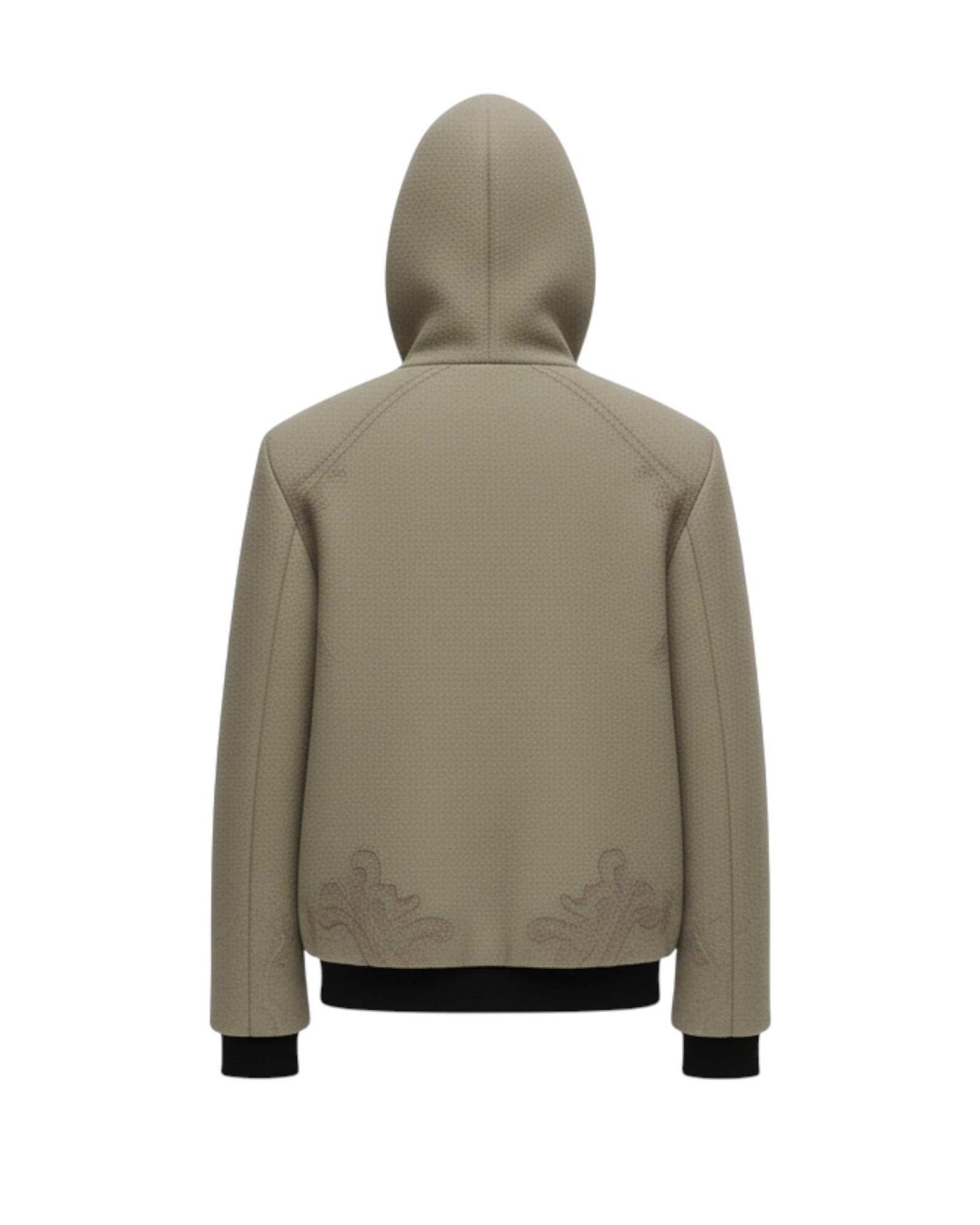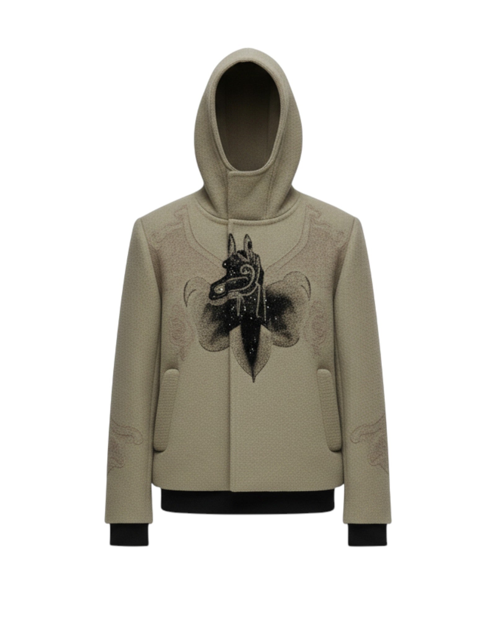 A unique hooded jacket crafted from textured jacquard fabric, featuring ancient African graphic on the chest. Designed for comfort and distinctive style.